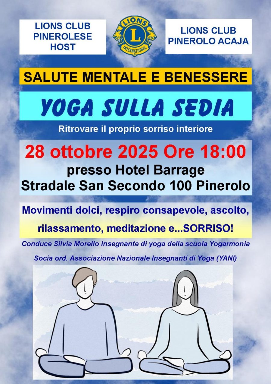 I Lions Club Pinerolese Host e Pinerolo Acaja Organizzano l’incontro dedicato alla salute mentale e benessere YOGA SULLA SEDIA Ritrovare il proprio sorriso interiore Martedì 28 ottobre, alle