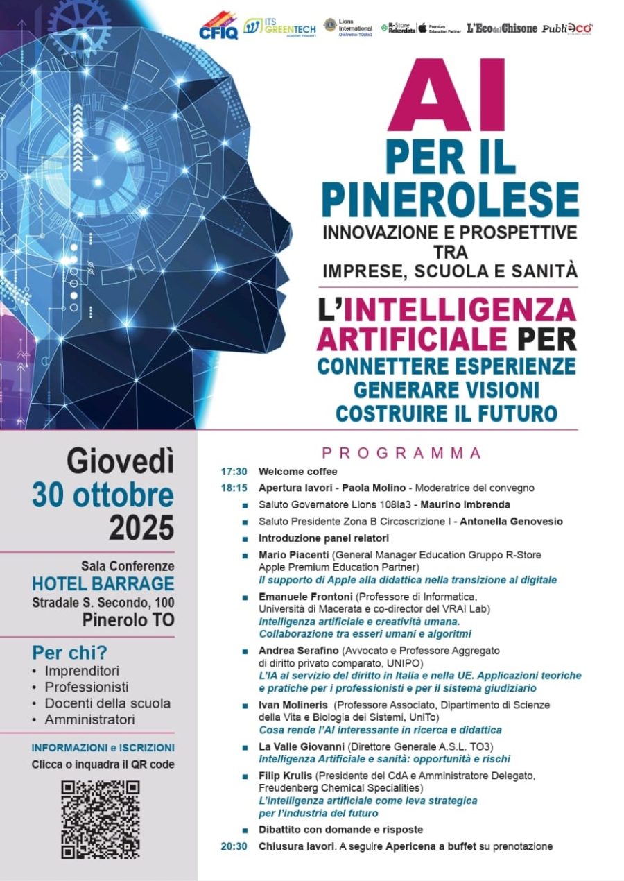 Il Distretto Lions 108Ia3 Invita al convegno AI per il pinerolese Innovazione e prospettive tra imprese, scuola e sanità Il convegno è in programma giovedì 30 ottobre, presso