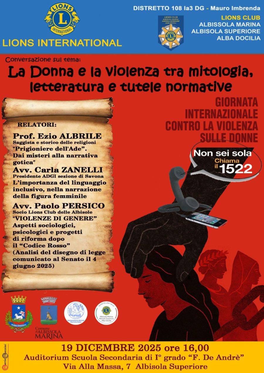 Il Lions Club Albissola Marina e Albisola Superiore – Alba Docilia Invita alla conferenza “La Donna e la violenza tra mitologia, letteratura e tutele normative” In relazione con