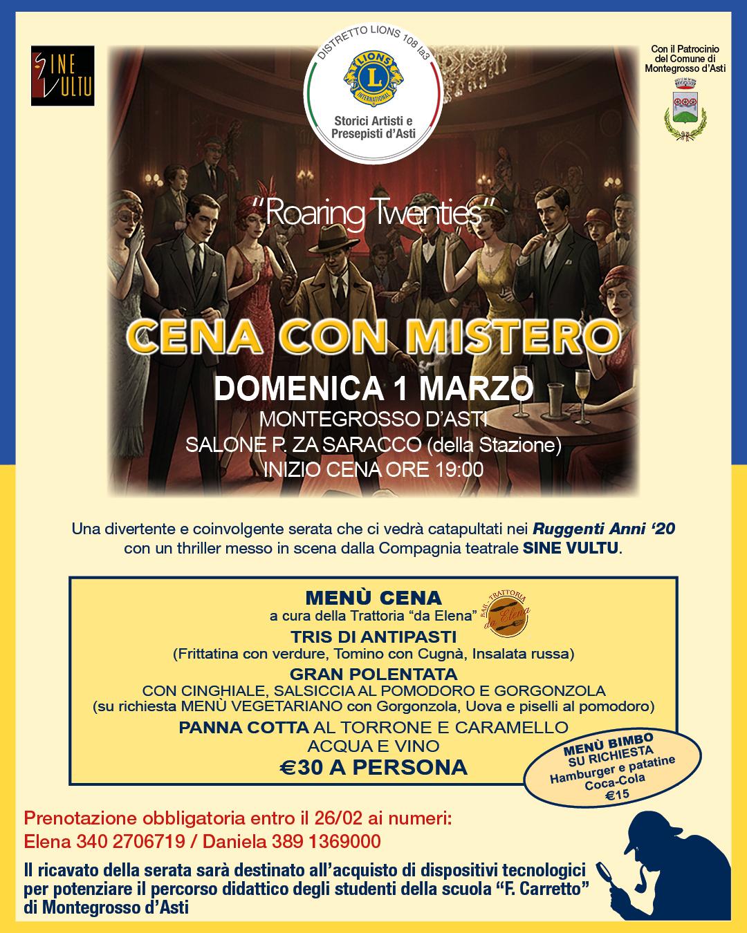 Una divertente e coinvolgente serata che catapulterà i convenuti nei ruggenti anni ‘20 con un thriller messo in scena dalla Compagnia teatrale Sine Vultu.