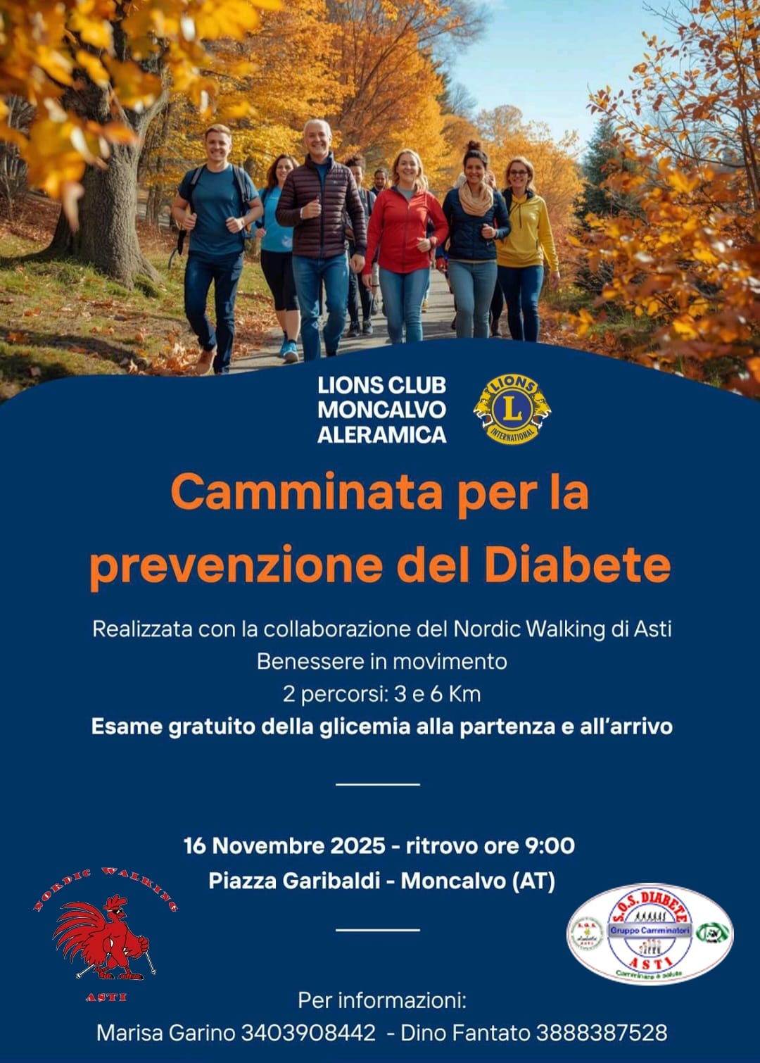 Per promuovere un sano stile di vita e prevenire il Diabete il Club organizza una camminata realizzata con la collaborazione del Nordic Walking di Asti. Questo benessere in movimento si articola in 2 percorsi: uno da 3Km e un altro da 6 Km. L’appuntamento è per domenica 16 novembre con ritrovo in piazza Garibaldi a Moncalvo (AT), alle ore 9.