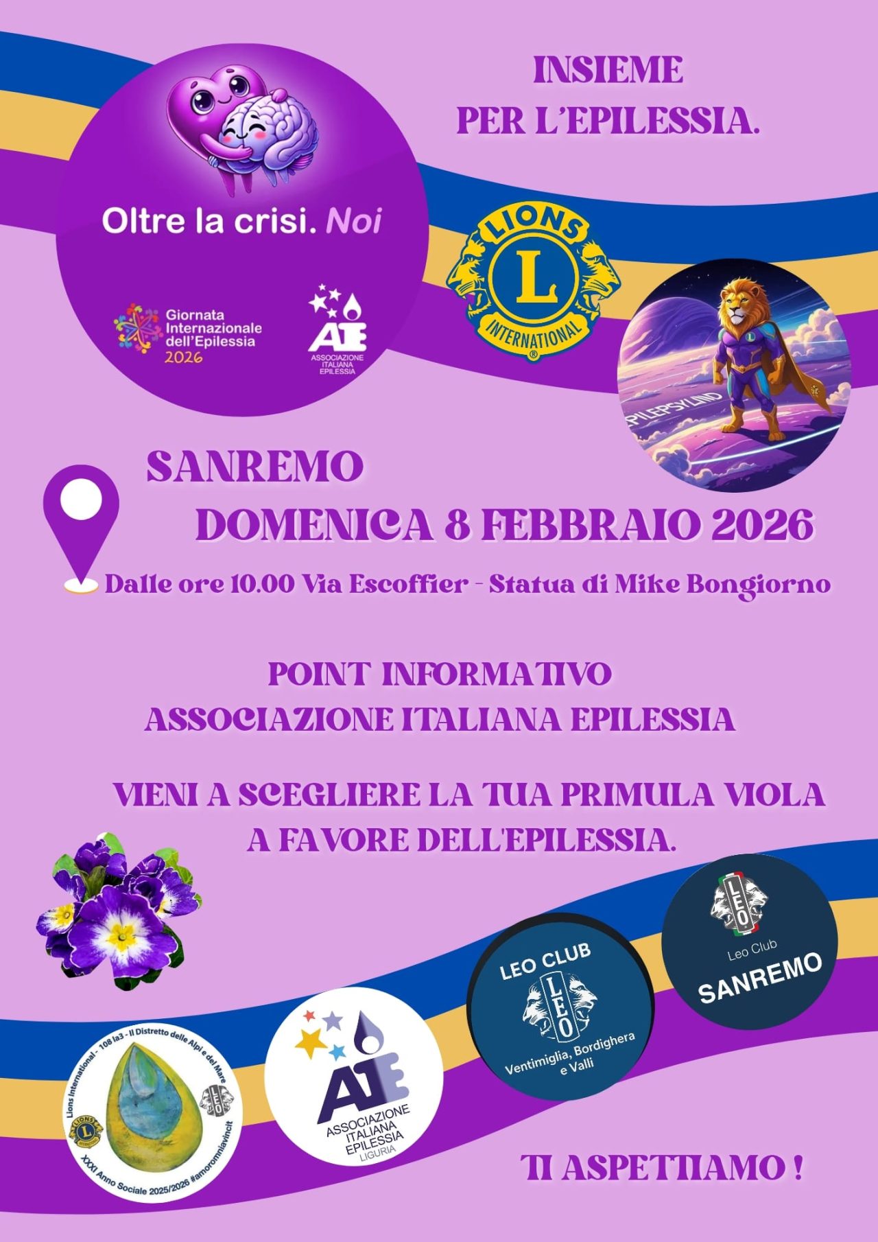 In occasione della Giornata Internazionale dell’Epilessia domenica 8 febbraio i Lions e i Leo scendono in campo a Sanremo, dalle ore 10 in via Escoffier (statua di Mike Bongiorno), con un point informativo insieme all’Associazione Italiana Epilessia.