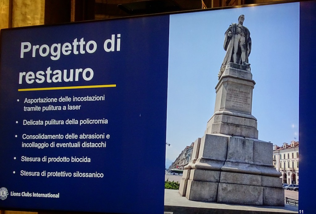 L’obiettivo è la statua di Giuseppe Barbaroux, posizionata nel bel mezzo di Piazza Galimberti. Il monumento, inaugurato il 10 agosto 1879, presenta ormai i segni del tempo, dunque richiede un incisivo restauro. Il Lions cittadino, che da tempo aveva ipotizzato la realizzazione di un service in questa direzione, ha colto l’occasione del suo anniversario per intervenire in termini operativi, con il duplice scopo di marcare la sua presenza in modo tangibile e potenziare la conoscenza dell’Associazione presso la cittadinanza.