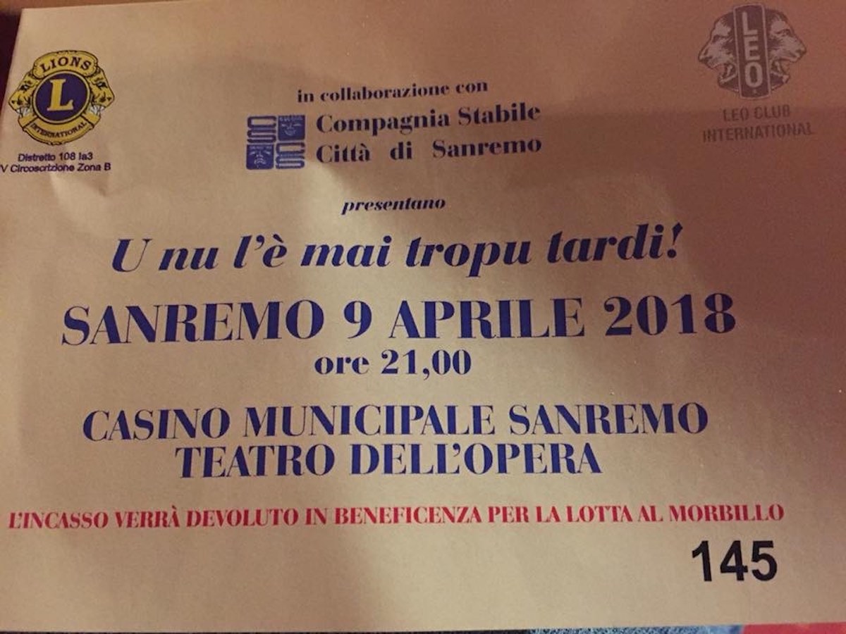 La zona 4B ha organizzato la messa in scena di una commedia in dialetto Sanremasco (U nu l’è mai troppo tardi!) che ha visto un pubblico attento e divertito contribuire alla raccolta fondi che la LCIF porta avanti per la lotta al morbillo. Lo spettacolo si è svolto il 9 aprile presso il Teatro del Casino di Sanremo ed ha permesso di consegnare alla LCIF, rappresentata quella sera dal SVDG Erminio Ribet, circa tremila euro.
