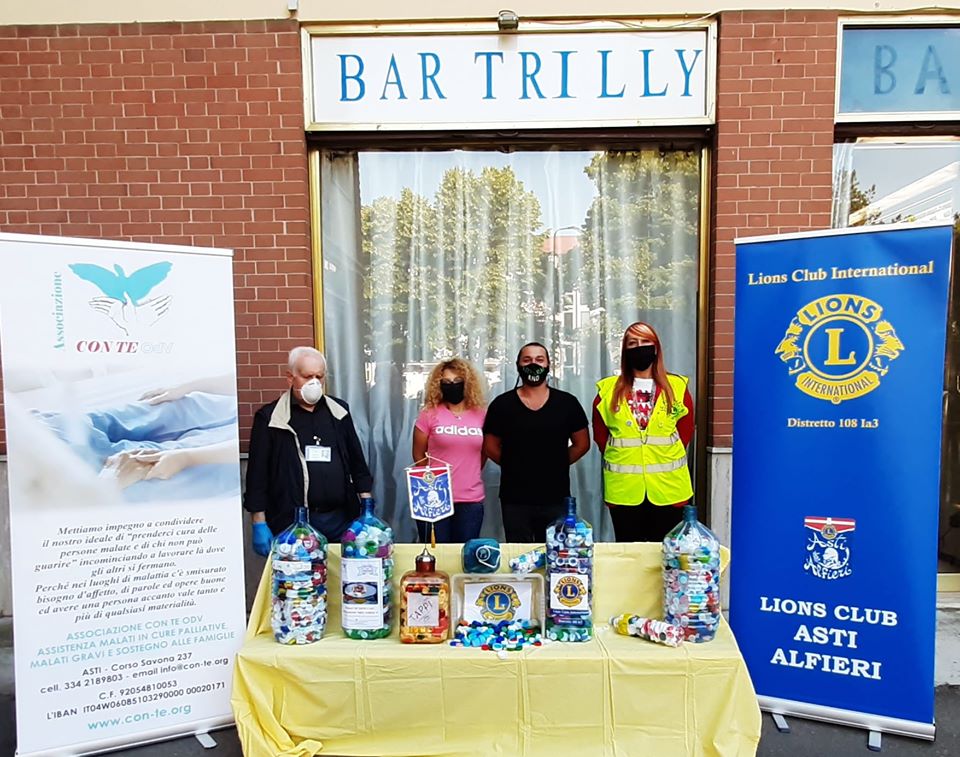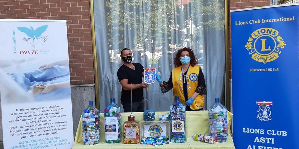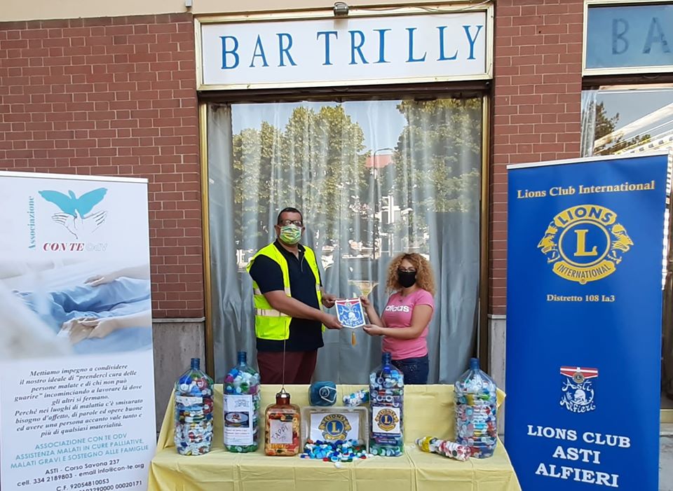 Ancora una grossa quantità di tappi di plastica raccolti e donati all’Associazione di Volontariato “Con Te – cure palliative”, da parte del Lions Club Asti Alfieri. Già nei mesi scorsi, prima delle note vicende e restrizioni legate all’emergenza COVID-19 i soci si erano adoperati nella sensibilizzazione verso amici e conoscenti per il recupero del prezioso materiale plastico. In particolar modo il bar Trilly di viale al Pilone, aveva risposto all’appello raccogliendo migliaia di tappi che, tramite i Lions, sono stati poi consegnati al signor Fares Cerrina, Presidente del lodevole sodalizio astigiano che si occupa di cure palliative (per maggiori info si cerchi in rete). La semplice cerimonia si è svolta nel piazzale davanti al bar, rispettando tutte le prescrizioni sulle attuali normative legate alla sicurezza personale.