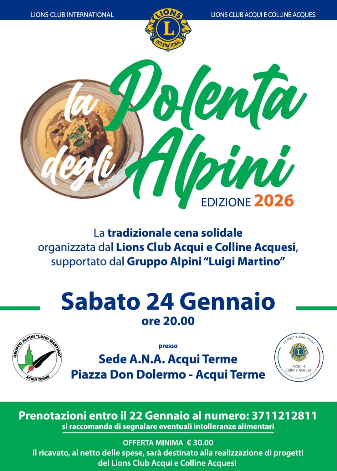 Sabato 24 gennaio – cena solidale: “La polenta degli Alpini”