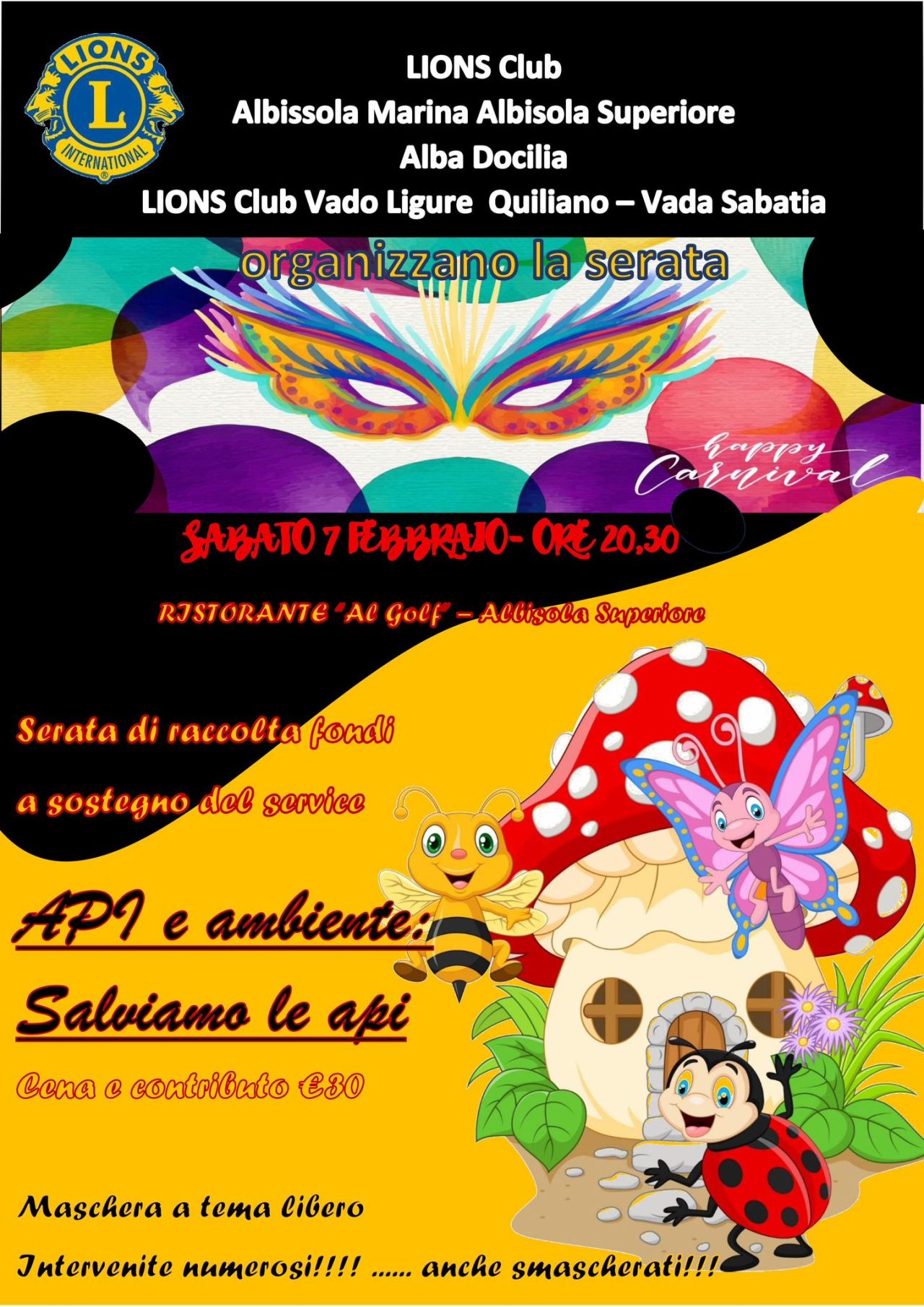 Sabato 7 febbraio, alle ore 20.30, presso il ristorante “Al Golf” di Albisola Superiore (SV), si festeggia il Carnevale (mascherati a tema libero, oppure senza maschera) sostenendo il service “API e ambiente: salviamo le api”. La serata di raccolta fondi prevede una cena e contributo.