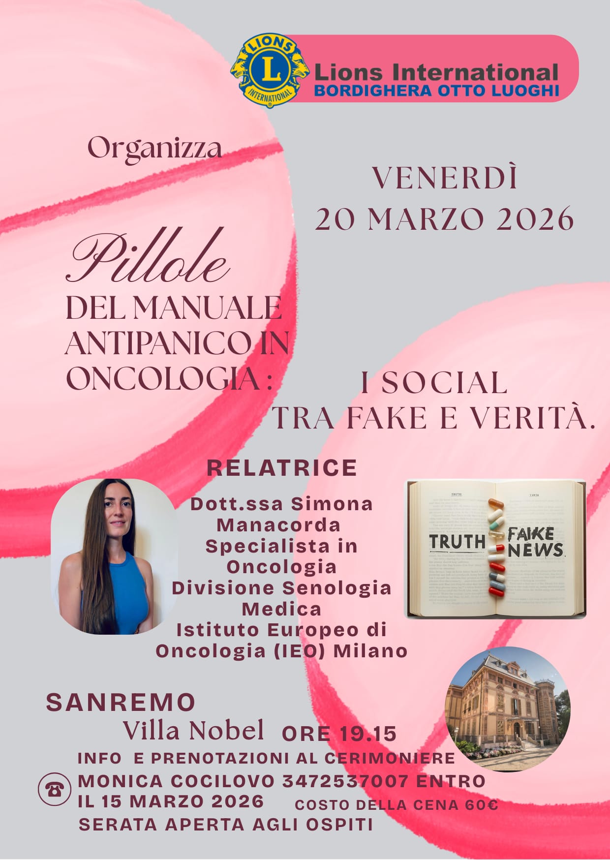 Villa Nobel in corso Cavallotti, 158 a Sanremo (IM) ospita l’appuntamento “I social tra fake e verità”, organizzato dal Lions Club Bordighera Otto Luoghi nell’ambito del ciclo “Pillole del Manuale Antipanico in Oncologia”. La serata è in programma venerdì 20 marzo, alle ore 19.15.