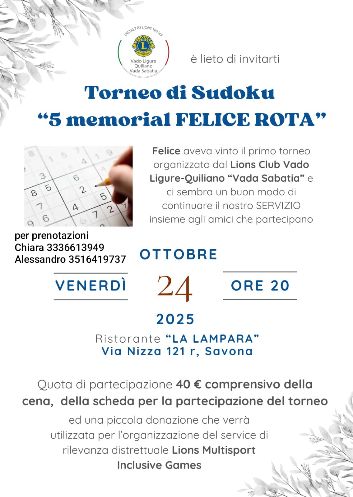La quota di partecipazione è comprensiva della cena, della scheda per il torneo e di una donazione che verrà utilizzata per l’organizzazione del service di rilevanza distrettuale Lions Multisport Inclusive Games.